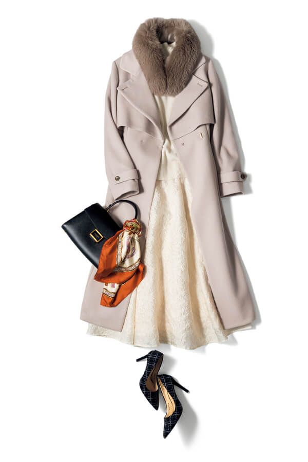 イルミネーションなど野外デートが増えるこの時期は、可愛さも写真映えも狙えるファー付きコートが適任。オフィスではファーを外して華やかさをキープして!