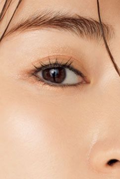 シャドウは1度で発色させようとしないのがポイント。Aをアイホールに何回か重ね塗りしてツヤを出し、グラデになるよう二重幅にBをなじませる。シャドウが淡い分、アイラインはしっかりめに。黒だと重いのでCのグレーで目のキワを埋めて。