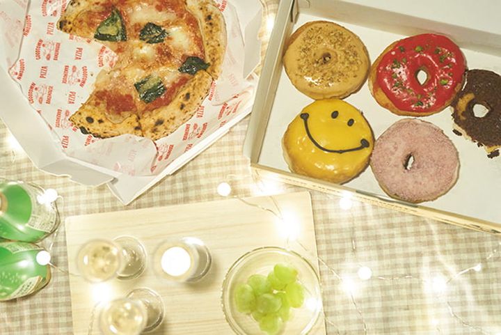 今回の夜ピクフードは、ピザとドーナツ、シャインマスカットにシャンパン風なジンジャーエールをチョイス。グラスは100円ショップでも買えるプラスチックのものがおすすめ。