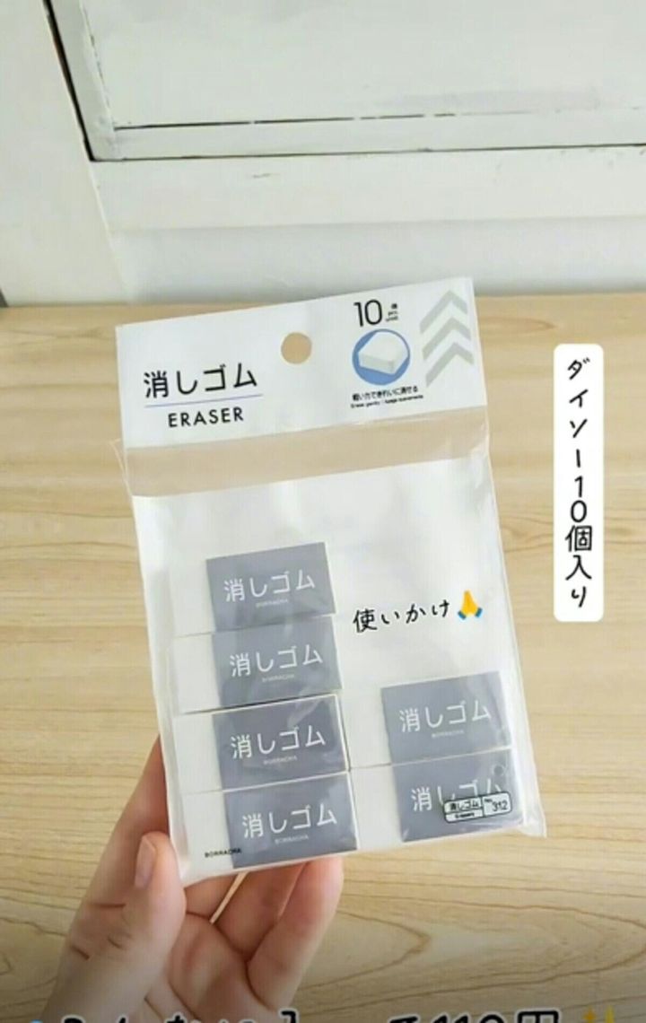 そこでおすすめなのが、ダイソーで販売されている消しゴムです。なんと10個セットで110円という驚きの価格。