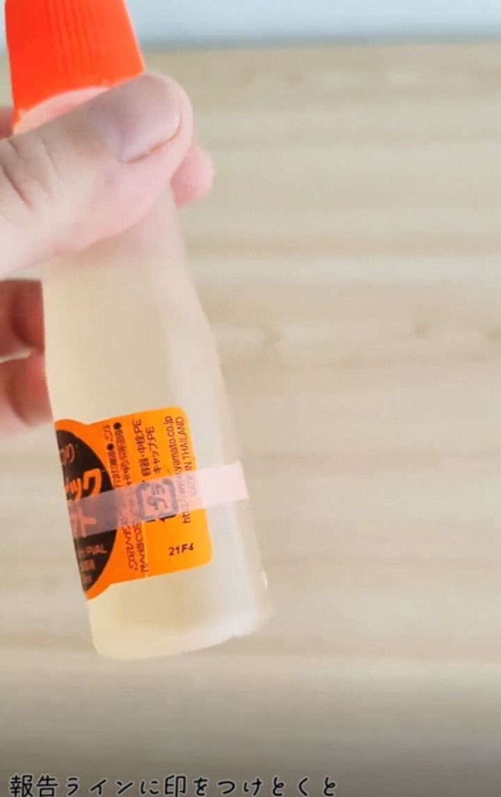 マスキングテープを一周させて印を付けます。このラインまで減れば報告する「報告ライン」として子どもに伝えておきましょう。子どもにも分かりやすいマークですよね。