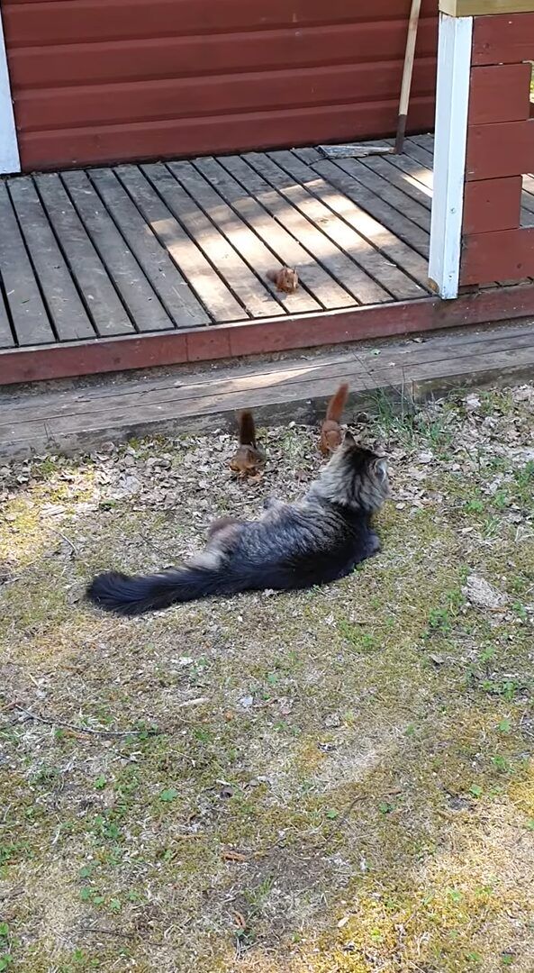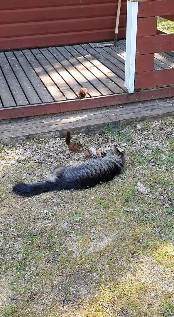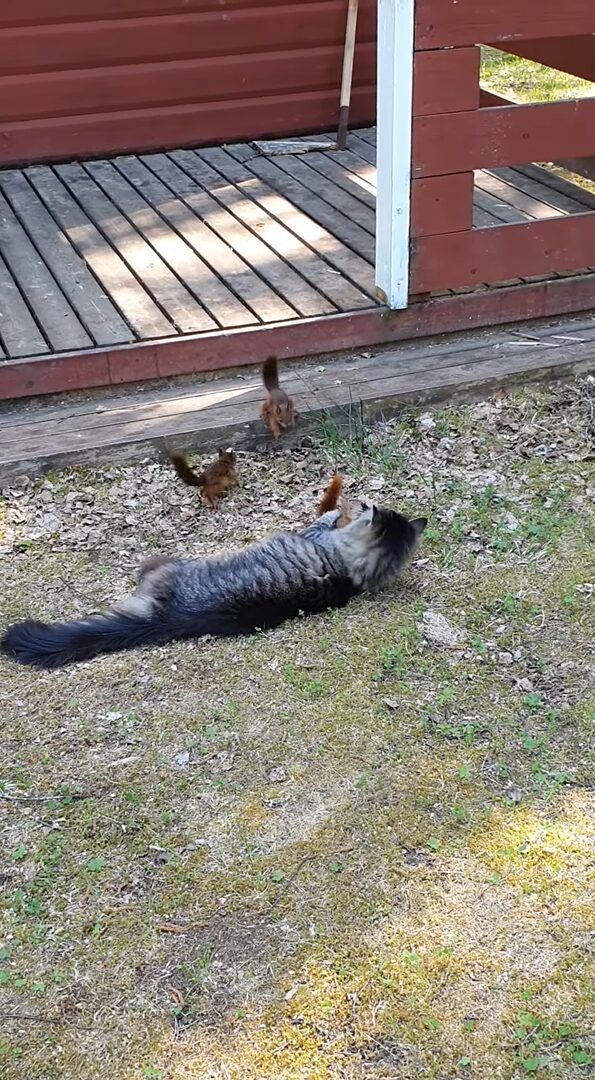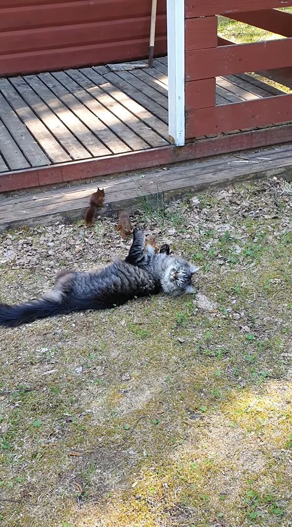庭でくつろいでいる猫に向かって駆け寄ってきたのは、なんと3匹のリス! 猫の遊び相手というのは、このリスたちだったのです