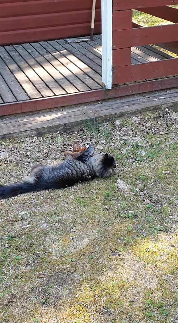 猫が庭で待つ遊び相手は、ご近所に暮らすというリス。 リスが飛びかかってくると、猫はその体を受け止めてそのままギュッと抱きしめました!