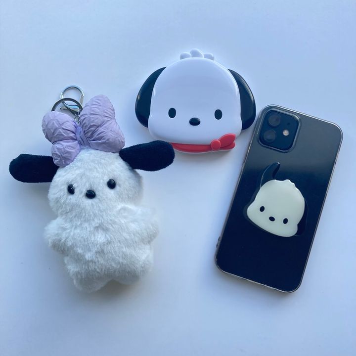 左から:ポチャッコ キーホルダー、コンパクトミラー+くしつき、スマホグリップ(すべて私物)