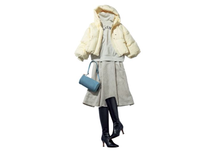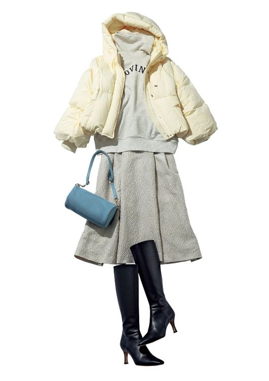 一見合わせるのが難しそうなスウェットとエレガントなスカートも、ワントーンで揃えれば意外とマッチ。艶のあるジャカードスカートがコーデを高見えさせてくれるので、ダウン合わせでもデート風に仕上がるのがすごい!
