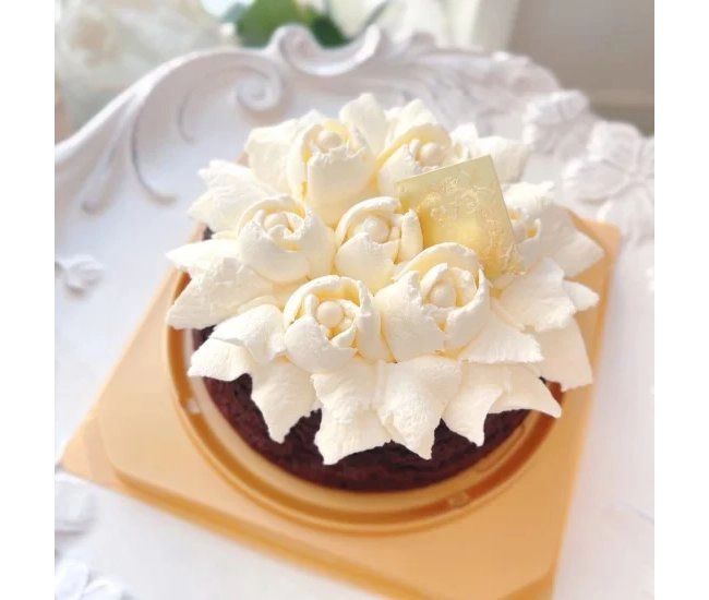 一面に広がる真っ白なバラがかわいい『L'angela(ランジェラ)』の冷凍ガトーショコラ。生ケーキを瞬間冷凍しているので、できたての味をそのままお家で味わえます。華やかな酸味が特徴の「マンジャリ」というチョコレートを使用しているのが特徴。粉をほとんど使用していないので、チョコレート好きの甘党男子にはたまらない濃厚な味わいです。