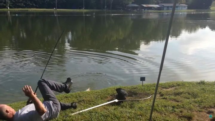 しかし、魚に気を取られたのか。 この男性は足を滑らせて転んでしまいました!