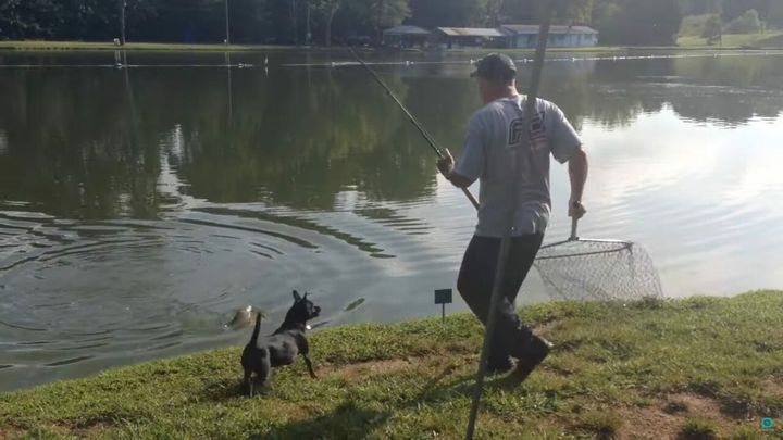 動画は、男性が釣りをしている様子を捉えたもの。 すぐ隣には愛犬もスタンバイしており、飼い主さんの釣果が確認できるのを待っているようです。