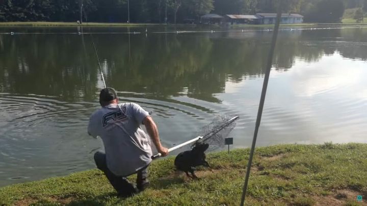 その際、タモ網から手を離してしまうのですが・・・、そこに愛犬がかかってしまいました!!