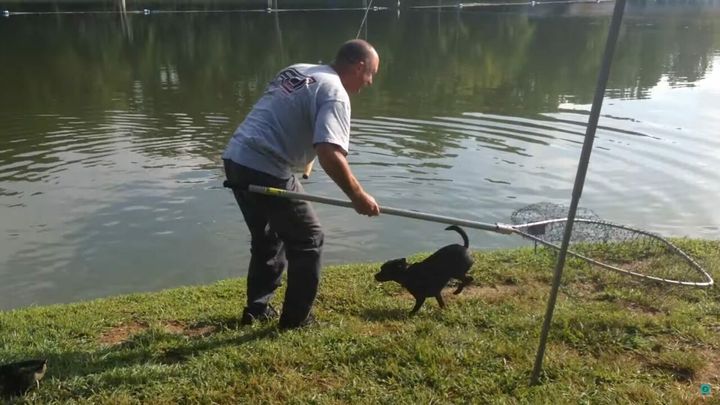 タモ網に魚ではなく愛犬が入ってしまうというハプニング。 その様子は、こちらの動画からご覧いただけます。