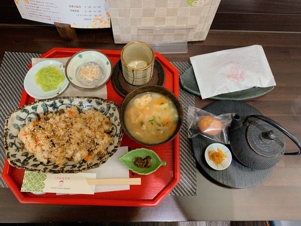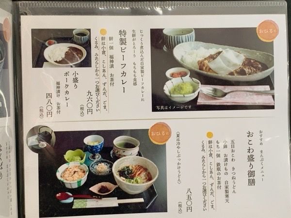 ランチにはお餅がトッピングされた特製ビーフカレーにまんぷくメニューのうどんもおこわもセットになったおこわ盛り御膳なども。