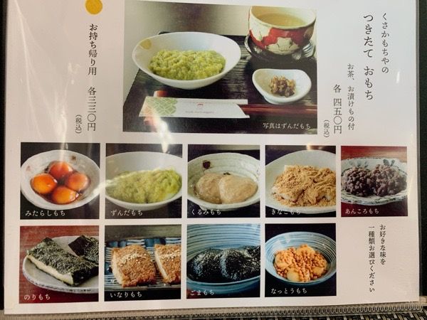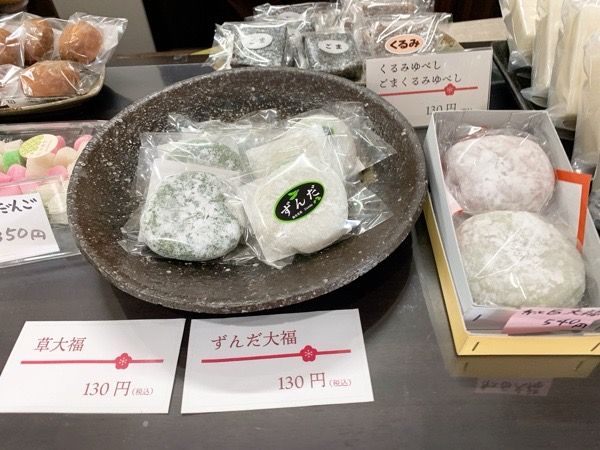 大福は、紅白大福(赤が小倉あん、白がずんだあん)、草大福、ずんだ大福があり、ゆべしはくるみゆべし、ごまくるみゆべしがありました。