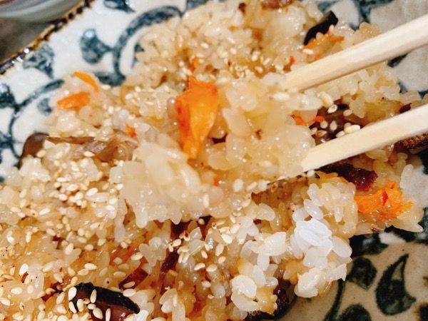 五目おこわはお米の粒が立っていてモチっとした食感でとても美味しい。