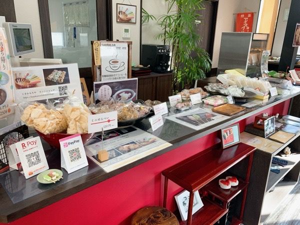 カウンターにはもち米を使用した和菓子やおこわなどたくさん並んでいました。