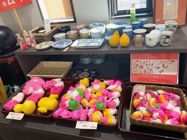 1月上旬のこの日は店内に入ると彩り鮮やかな大黒様やうちでの小槌、鯛など、縁起が良い小正月飾りがたくさん並んでいました。