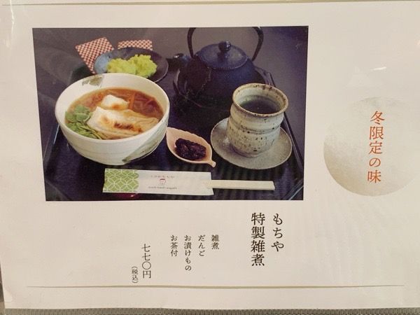 こちらは冬限定のもちや特製雑煮。だんごもついていてお餅好きには最高ですね。