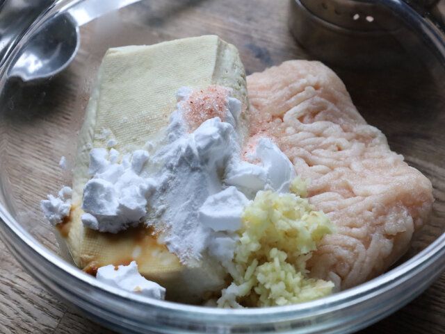 ・木綿豆腐は、キッチンペーパーを二重にして包み、電子レンジ600Wで2分ほど加熱し、取り出したら、使う時まで重しを乗せて水切りする。
