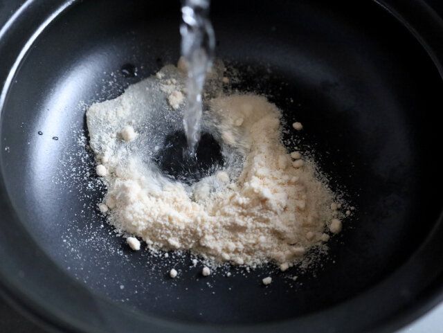 ② 土鍋に顆粒鶏ガラスープの素としょう油、水を入れ火にかけて、沸かす。