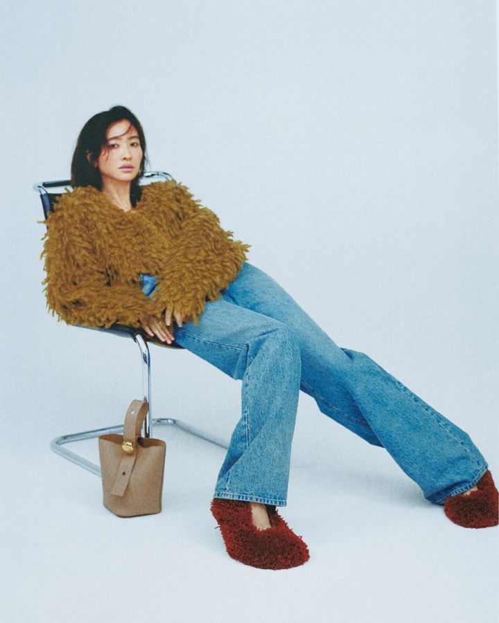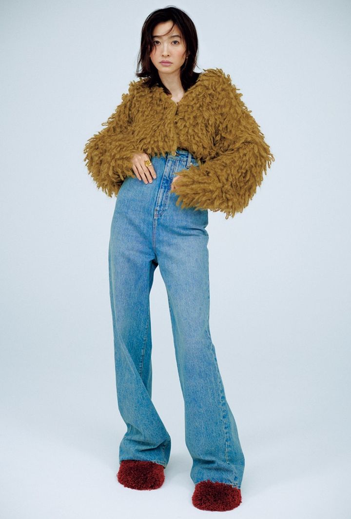 ロエベのデニムファン必見なのが、高いウエストと長いレッグのプロポーションが特徴の新作。ビックリするほど脚長に! カーディガン¥390,500、デニムパンツ¥137,500、ピアス¥59,400、リング¥126,500、パンプス〈トイ ラグ〉[ヒール9㎝]¥344,300(全てロエベ/ロエベ ジャパン クライアントサービス)