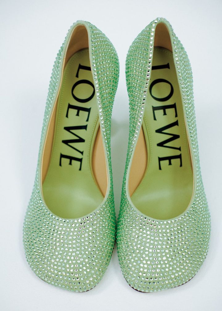 ヴィクトリア・ベッカムも惚れた「トイ」パンプスは、足がキレイに見えるだけでなく、安定感があって歩きやすい実用性の高さも魅力。今回新たに絵美里がはいた「トイ ラグ」パンプスと、キラキラした「トイ バレリーナ」の2つがお目見え。パンプス〈トイ バレリーナ〉[ヒール9㎝]¥234,300(ロエベ/ロエベ ジャパン クライアントサービス)