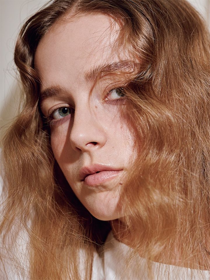 肌色の延長で色づくピンクのリップに新たな風を。それと同じく肌色と遠くない色味のミステリアスな「バイオレット」を目元にしのばせれば、奥行きが生まれてかもす雰囲気に変化が。 ブラウス 22,000円/ソージュ(ソージュ オンラインストア)