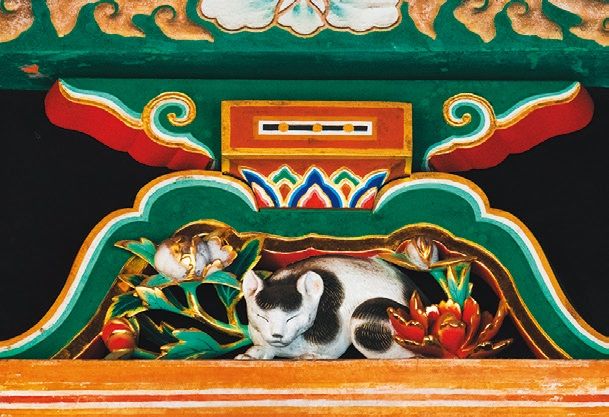 境内のあちこちで彫刻作品が発見でき、その総数は実に5000点以上にのぼるとか。その中で特に有名なのが、神厩舎(しんきゅうしゃ)の見ざる聞かざる言わざるの「三猿」。人間の生涯を風刺した彫刻がとてもユニーク。また「眠り猫」も必見。真裏に2羽の雀の彫刻があり、猫が眠っていると雀が安心していられる、つまりそのくらい世が平和であることを願って彫られたといわれる。眠り猫が彫られた門をくぐり、森の中の石段を上っていくと、徳川家康の墓所がある奥社にたどり着く。境内の最も高い標高に位置し、東照宮随一の神聖な場所で、静けさの中に厳かな雰囲気が漂い、なんとも神秘的で、強いエネルギーをひしひしと感じる。