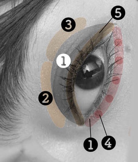 アイホールと涙袋にマットなAの①を塗ってベースに。目頭側1/2にAの②、黒目上から骨に沿って③のグリッターをのせて骨格を強調。きわに⑤を細く塗って引きしめて。下まつ毛のすき間を埋めるように④を点で置く。眉はBのパープルをかぶせて透明感を高めて。
