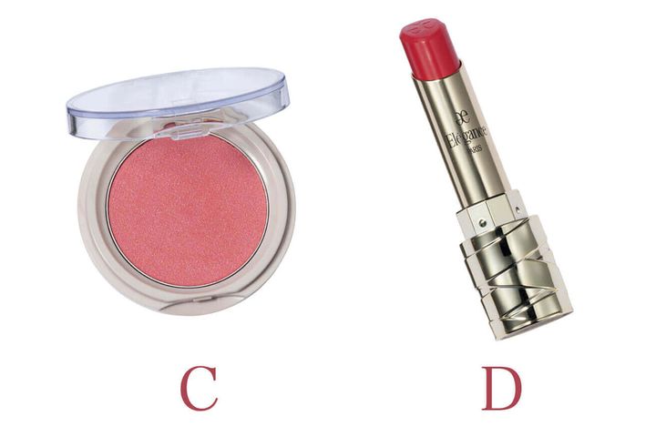Cをブラシで鼻の横から放射状にふんわりと。リップはDを輪郭どおりに。