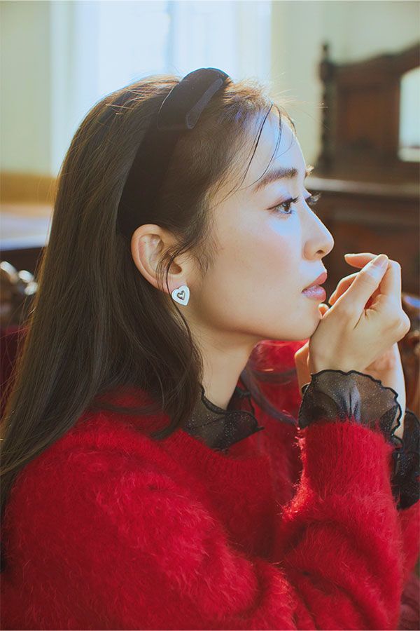 カチューシャ¥6,900/Her lip to カーディガン¥17,600/CELFORD インナー¥3,949/VIS ヤリング¥1,540/アネモネ(サンポークリエイト) リング[人さし指]¥61,600/ココシュニック(ココシュニック 新宿タカシマ店) リング[中指]¥4, 180/アプロ(ロードス)