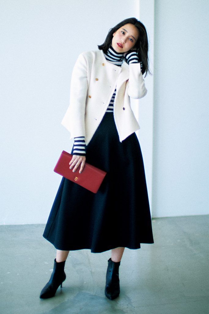 親近感アップのボーダーをデートで着るなら、フレアスカートでレディに昇華すると◎。ショート丈の白ツイードジャケットを加えることで、メリハリのある洗練ムードが宿ります。仕上げに赤のクラッチバッグを選び、思わず目を惹くチャーミングな女性像に。