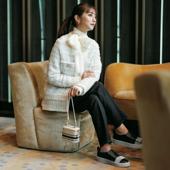 憧れホテルでのラウンジデートでは、ボウタイブラウス×ツイードジャケットで華やかなリッチコーデを楽しみたい。トゥーマッチにならないよう、足元はスニーカーで気負わないムードを手に入れて。メゾンブランドならカジュアルになり過ぎず、場に相応しい絶妙な抜け感を添えてくれるはず。