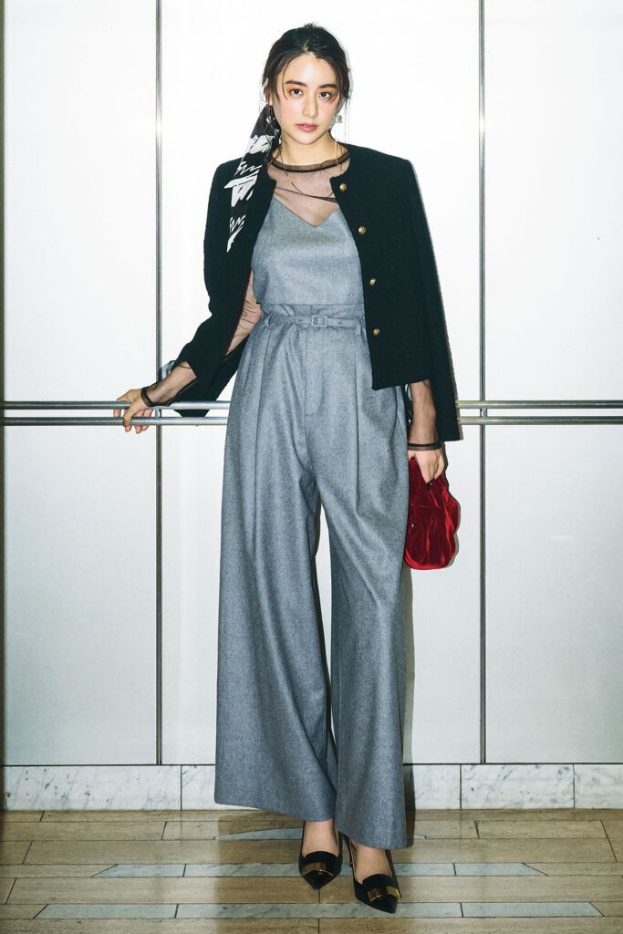 ディナーデートにはきちんと感をキープしつつ、黒よりもこなれムードを醸し出すグレーパンツが新勢力に浮上。キャミソールとのセットアップにツイードジャケットを羽織れば、ホテルディナーもOKなよそ行きコーデが完成。ボルドーのベルベットバッグで、艶やかな女性らしさを添えて。