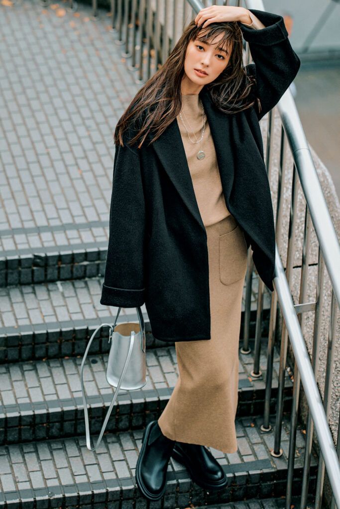 どんな着こなしにもマッチする、頼れる相棒・黒コート。ベージュのセットアップで縦長ラインを作ると、細見え効果が狙えます。シルバーバッグで辛口なスパイスを効かせれば、メリハリがある今っぽデートコーデが完成。