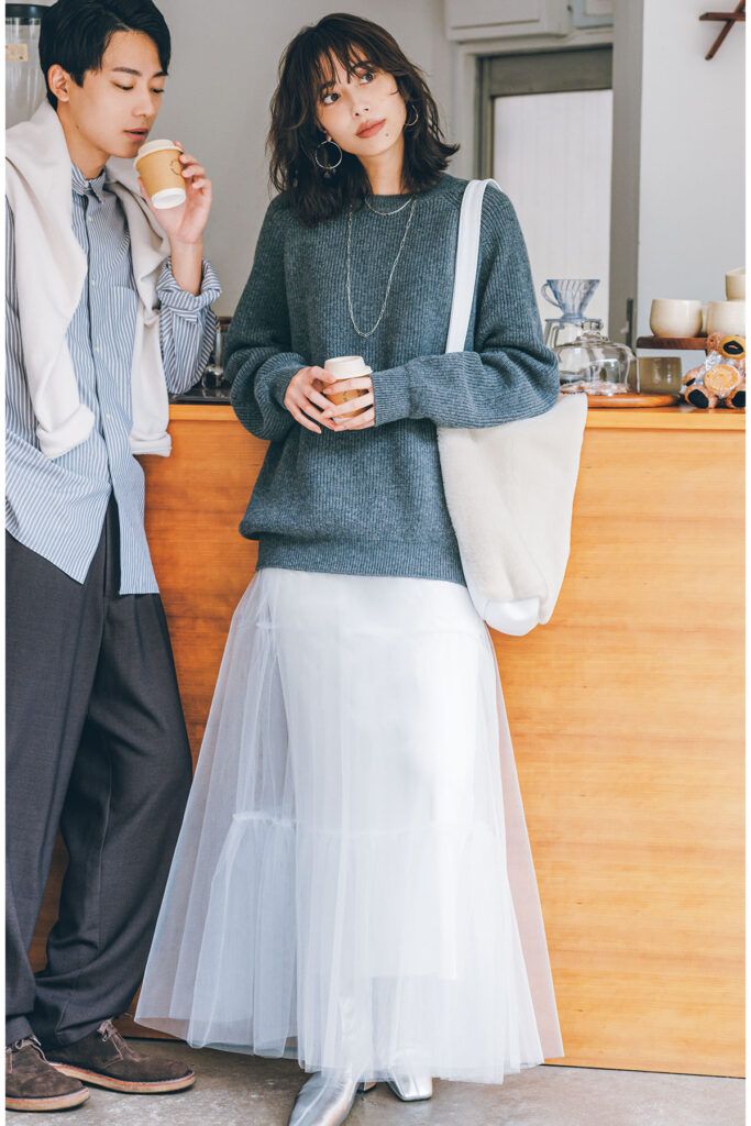 彼とシェア可能なオーバーサイズニットは、子どもっぽくならないチャコールグレーをセレクト。ドラマティックな白チュールスカートも、端正なニットのおかげで甘過ぎない着こなしに。メタリックなシューズやシルバーアクセの華やぎアイテムで、デートの高揚感を高めて。
