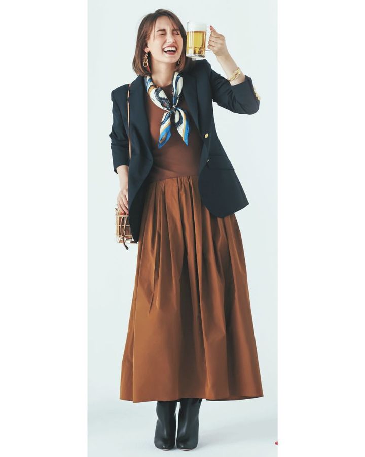 きちんと感も可愛さも確保したブラウンワンピ×紺ブレなら、退勤後のデートにも自信を持って臨めます。お腹周りの立体的なタックにより、体型カバーが叶うのも嬉しいポイント。真面目な印象になりすぎないよう、柄スカーフで華やかさを添えるのがセンスアップの秘訣です。