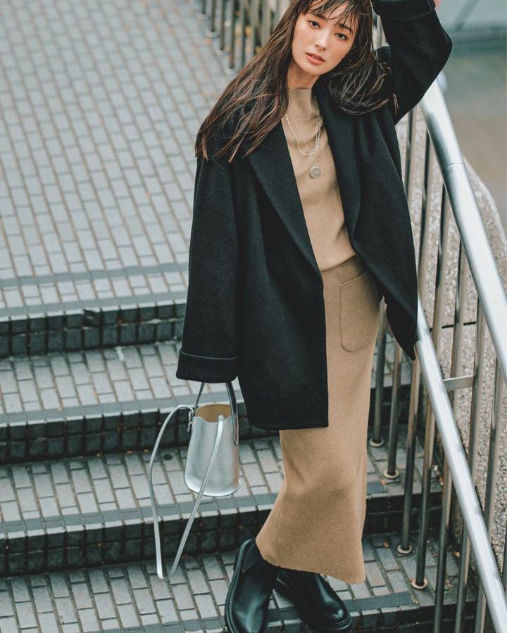 コート¥53,900(アルページュストーリー)ニットとスカートのセットアップ¥17,930(Mila Owen)バッグ¥114,400(J&M デヴィッドソン/J&M デヴィッドソン カスタマーセンター)ブーツ¥3,990(GU)チェーンネックレス¥47,300(プリュイ/プリュイ トウキョウ)コインネックレス¥27,500(チビ・ジュエルズ/チビジュエルズ・ジャパン)