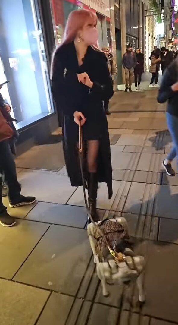 愛犬を連れて、街を闊歩するオシャレな女性。 しかし、リードの先にいる愛犬の姿に違和感があります。