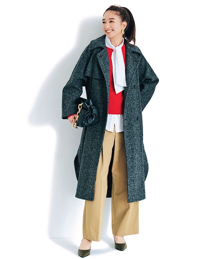 食事会では、印象に残る華やかレイヤードで臨みたい。コートとパンツはベーシックにまとめ、赤ニット×ボウタイブラウスを引き立てるのがポイント。ヘアをキュッとアップにして、顔回りをすっきりさせるテクもファッションの一部として取り入れて。