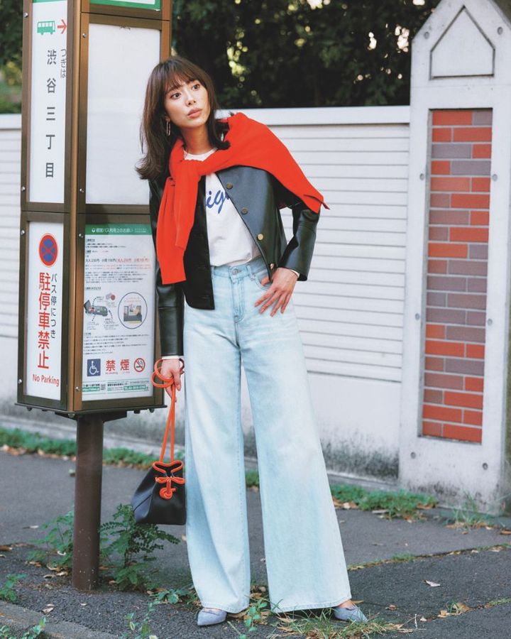 クールな表情を醸し出すレザージャケットは、メンズライクになり過ぎないようひと工夫を。気取らずこなれた雰囲気のバギージーンズで、親しみやすさを取り込むのがカギです。肩掛けした赤カーデで、女性らしい華やかさをプラス。