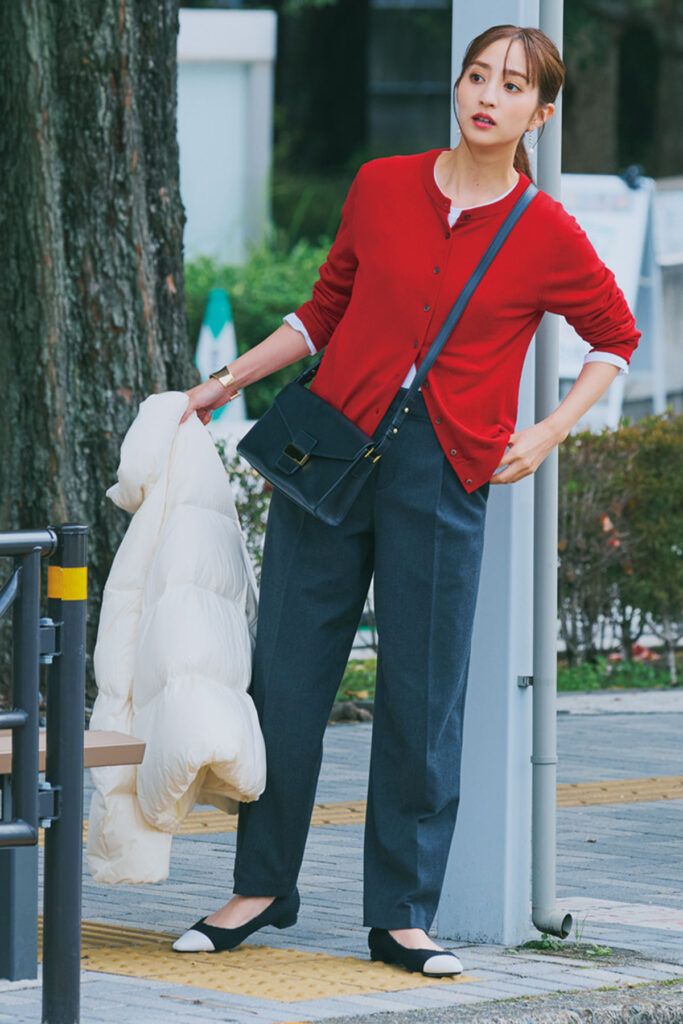 辛口アウターには女性らしさを授ける赤カーデをスパイスに