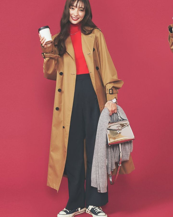 冬の定番・タートルネックは、つい安心感のあるスタンダードカラーを選びがち。周りとかぶりがちな着こなしから一歩脱却するには、赤タートルにチェンジ。いつものコート×黒パンが一気にあか抜けて、大人のさりげない可愛さを演出。