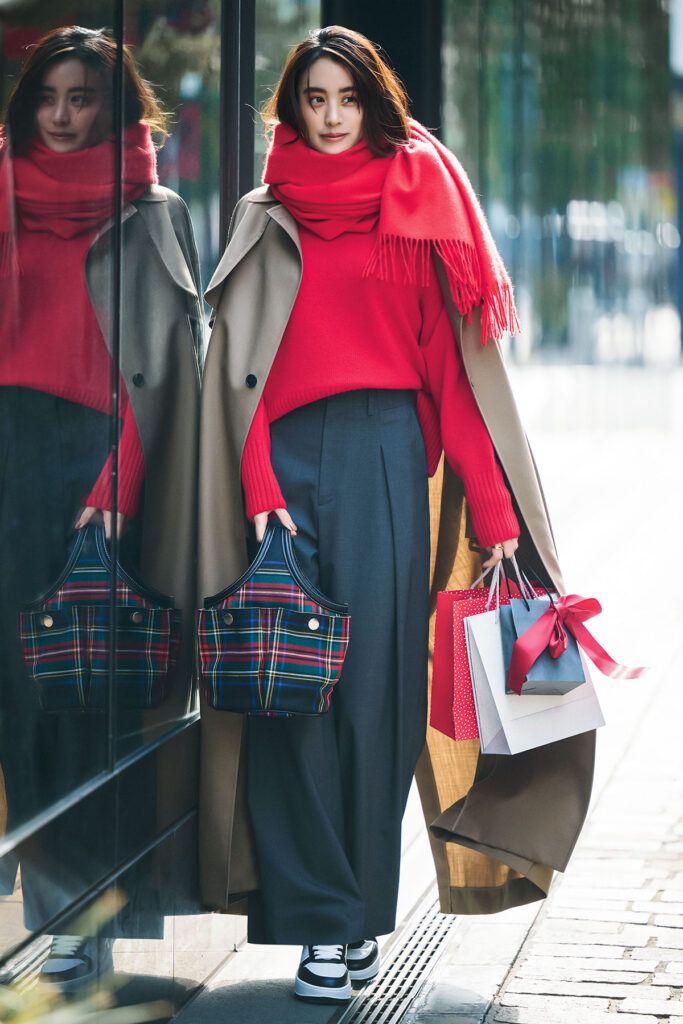 グレーパンツ×スニーカーのボーイッシュな着こなしは、女性らしい「赤」で鮮度アップを狙って。赤セーターとストールで特別感をたっぷり堪能するのも、今季ならではの楽しみ方。赤を拾ったチェックバッグでトラッド要素を足せば、茶目っけ溢れる大人の休日カジュアルが完成です。