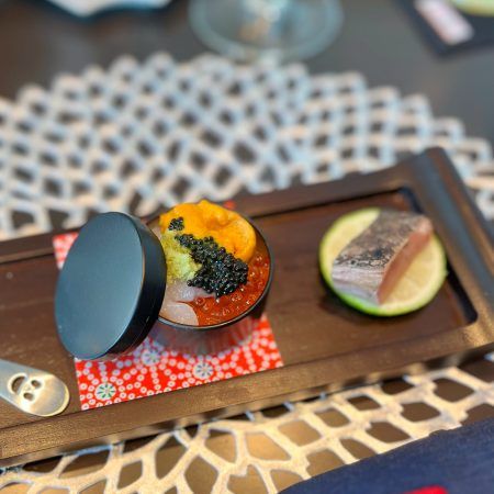 コース内の「ウニ・キャビア・いくら・白エビの寿司」は豪華な食材はもちろん、目にも楽しい一品です。