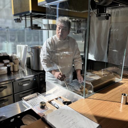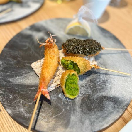 東京・大阪のミシュラン一つ星の串揚げ店「六覺燈」で料理人をしていた津田氏が立ち上げたブランド。本店は名古屋にあります。 ふわっさくっと食感で、素材の味が際立つ串揚げを目の前で揚げてくれる贅沢なお店、素材も日本各地の海鮮や野菜など多岐に渡ります。写真は代表の津田 猛さん!自ら揚げてくれました。
