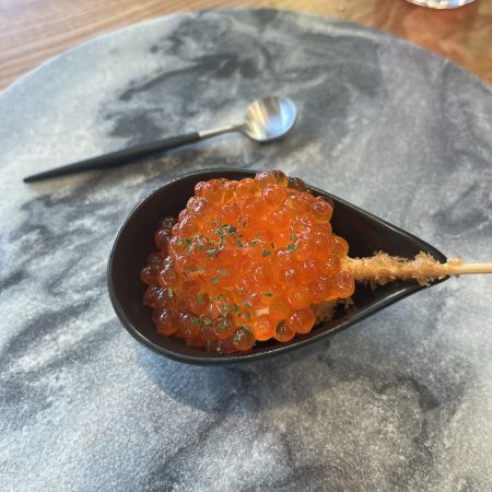 おすすめは、揚げたサーモンにいくらをこぼれるほどのせた「サーモンと北海道産いくら」(600円)、