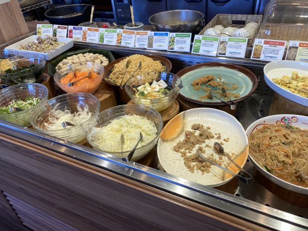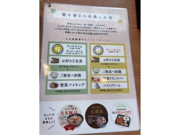 時間帯によって変わるのですが、「総菜バイキング」もしくは「健康ドリンクバー&ソフトクリーム」の2種類が選べます。