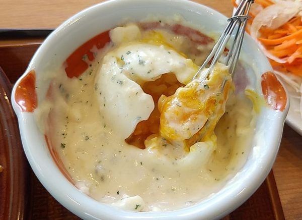 このタルタルソース、なんと半熟卵を自分で潰して仕上げるようになっています。これをチキン南蛮にかけていただきます。