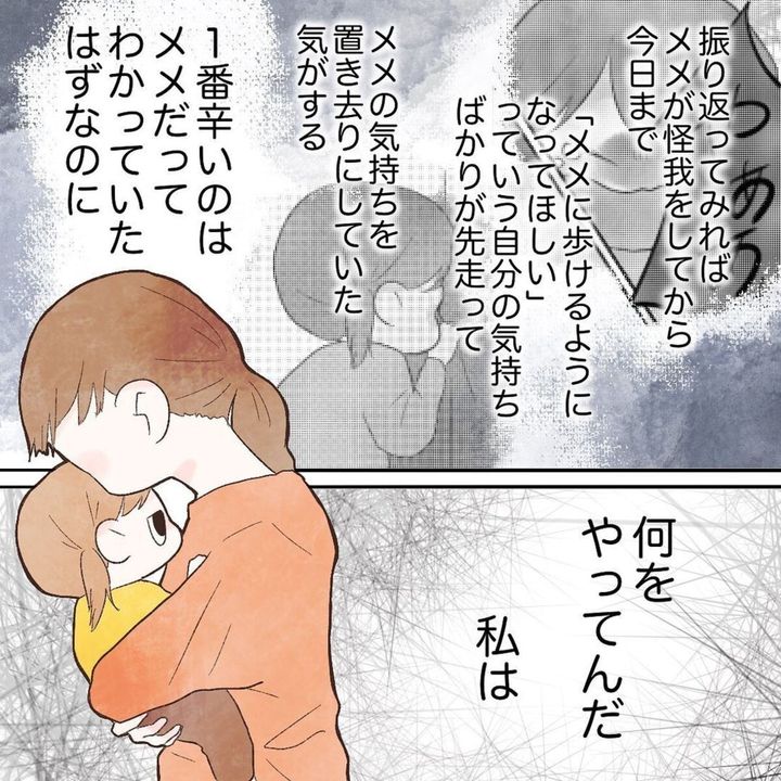 メメちゃんのペースに合わせようと思っていたはずなのに、心の底では「早く歩けるようになってほしい」という願いが先走っていたと気づいてしまったまろさん。メメちゃんは小さな体で何かと闘っているようです。さまざまな感情があふれ出して、まろさんの胸にうずくまるしかなかったのかもしれません。