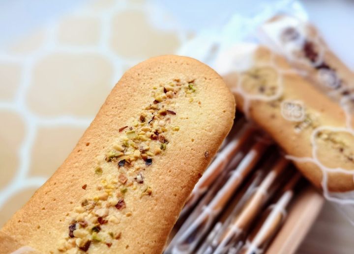 フランス産の発酵バターを使った王道ラングドシャ「ナッツ」。薄くてサクッとした食感の生地はバターが芳醇。細かいアーモンドやピスタチオをのせ、バターとナッツのハーモニーも優雅です。