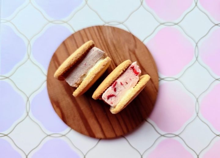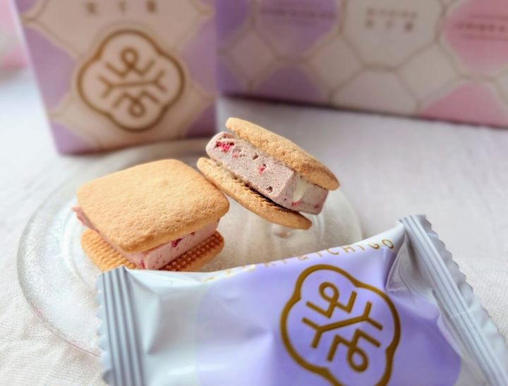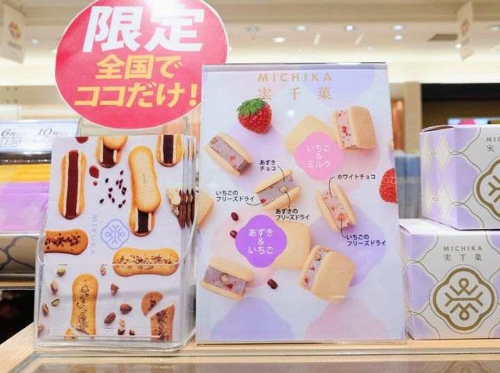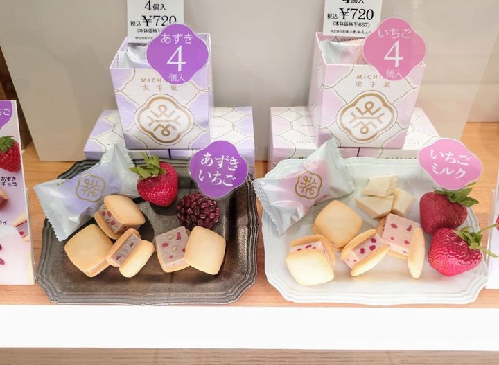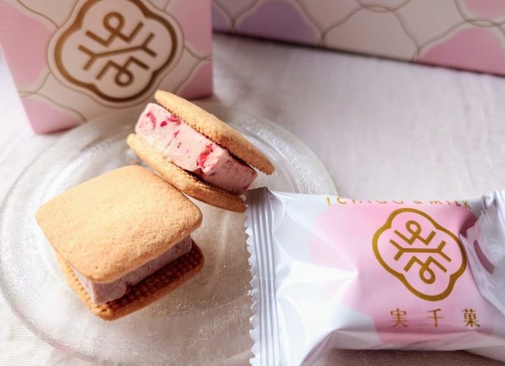 ホワイトチョコにいちごのフリーズドライを合わせたクッキーサンド「実千菓(みちか)」。和のいちご大福をイメージした「あずき&いちご」、洋のショートケーキをイメージした「いちご&ミルク」の2種類。
